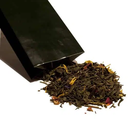 Thé vert légèrement aromatisé aux saveurs exotiques de couleur vert foncé, riche en vitamine C, thé pour l’après-midi